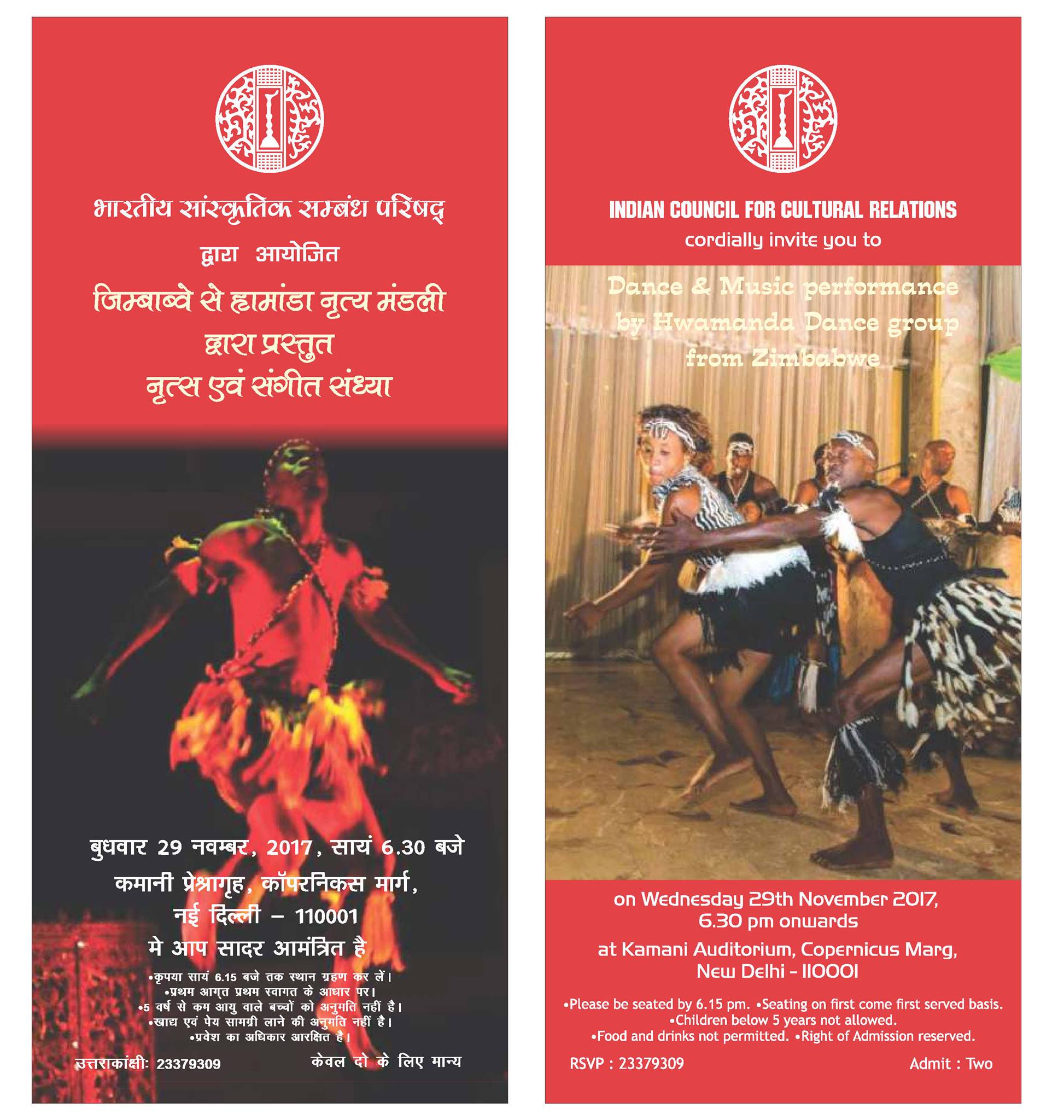 Dance & Music Performance by Hwamanda Dance Group Admin·November 22, 2017When: November 29, 2017 @ 6:30 pm – 9:30 pm Where: Kamani Auditorium, 1, Copernicus Marg, New Delhi,...Dance·0 Comments·
