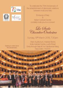 admin··March 16, 2018Concert by La Scala Chamber Orchestra,Stein Auditorium, India Habitat Centre Calendar When: March 18, 2018 @ 7:30 am – 12:00 pm Asia/Kolkata Timezone 2018-03-18T07:30:00+05:30 2018-03-18T12:00:00+05:30 Where: INDIA HABITAT CENTRE, LODHI ROAD