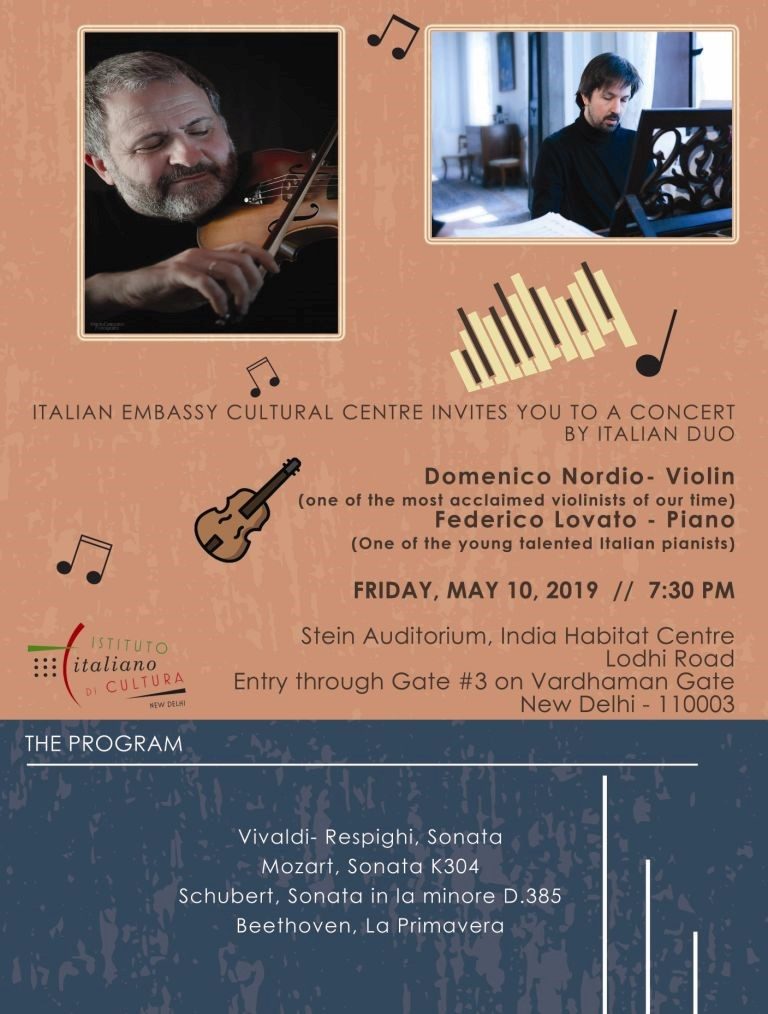 Italian Embassy Cultural Centre is pleased to invite you all for the Piano and Violin concert by Italian Duo – Federico Lovato (Piano) and Domenico Nordio (Violin) on Friday, 10th May 2019, 7:30pm at Stein Auditorium, India Habitat Centre.